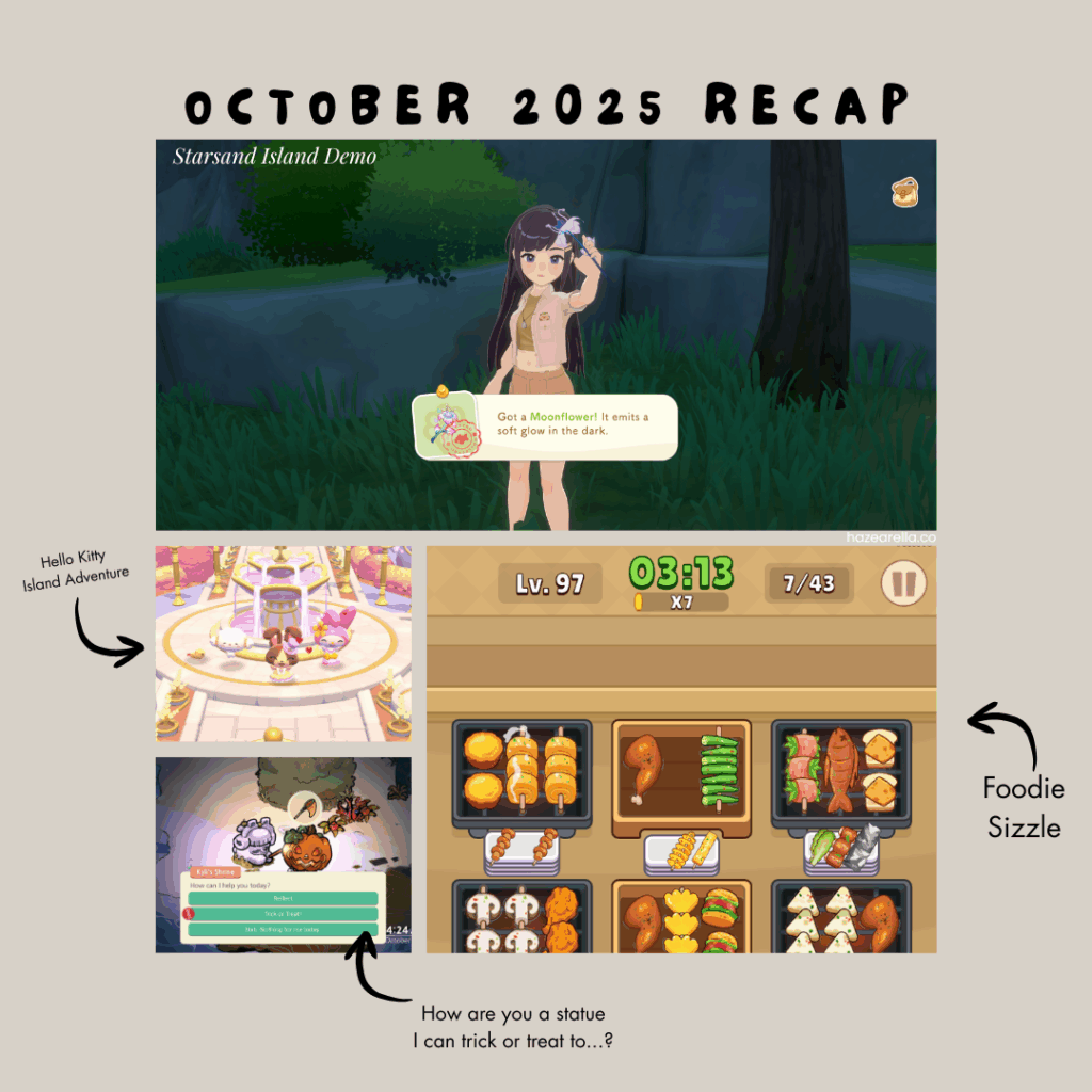 I can’t believe it’s the end of October, and I can’t believe I never thought to do a gaming monthly recap before. I didn’t discover or try very many new games this month; I went back to Cozy Grove: Camp Spirit and Hello Kitty Island Adventure to catch up on the stuff I didn’t get from the previous events, despite that the game wasn’t even out on Steam back then…